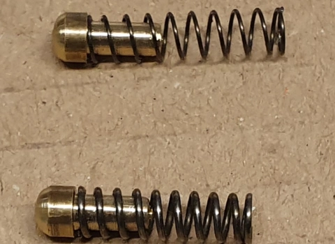 XS/QB/TH 78/79 Trigger has the flat end of the spring pushing on the rear and can feel poor when pulling the trigger as it rides at different angles, So I made a Spring Guide with our optional (in trigger kit) weaker trigger spring above to show the difference. Ball front to ride the rear of the trigger smoothly.